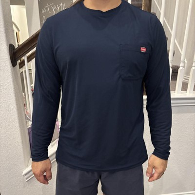 [This review was collected as part of a promotion.] This men’s size medium shirt fits true to size. The shirt has long sleeves and a crewneck. It has a single pocket on the chest that has a small logo patch. The shirt is made from a soft performance material. It is a solid dark blue color. The shirt is lightweight and comfortable. It is part of the workwear line but can also be worn casually or when being active. It is a great quality for a nice price. I received an incentive to write this review.