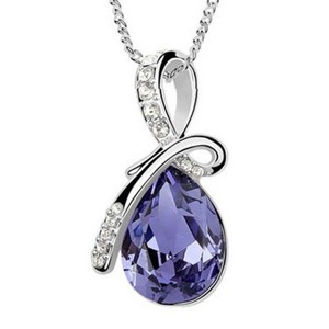 This elegant necklace is uniquely designed and features a dazzling tear-shaped crystal. Tiny crystals also are embedded in the ribbon design above. The necklace is silver plated and contains tin alloy on the inside. Pair the necklace with an elegant evening gown as the perfect finishing piece. Available in a variety of colors. Dimensions: Crystal, 0.56"L x 0.38"W; Pendant 1.06"L x 0.56"W; 16 inch chain with 2 inch extension. Material: Crystal, Silver Plating, Tiny Alloy.