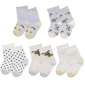 Cute and colorful baby and toddler socks that will keep little toes warm. These adorable socks are made with a soft cotton blend and are super comfy. Each pair of socks feature playful designs and patterns that will make the socks a delight to wear. The set consists of 5 pairs of socks in a prepackaged box; perfect for baby showers and gift giving.