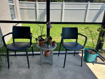 [This review was collected as part of a promotion.] The perfect addition to my enclosed patio are these beautiful chairs. They are comfortable they are stylish. They are stackable need I say more.