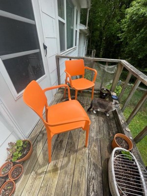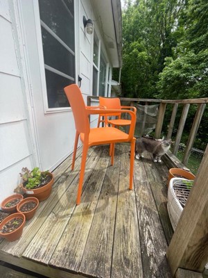 [This review was collected as part of a promotion.] I received this product complementary for my honest review. Wow, I’m overjoyed with the quality of these chairs! The style is simple yet modern. The material is hard resin, sturdy and tough enough for indoor/outdoor use. They come in many colors. The color I chose is orange and is a lovely shade that brings me joy just to admire while I relax in them. The chairs are comfortable and have good back support and arm rest. They are light weight and easy to stack. They have caps on the bottoms of the legs to protect and prevent damage. These chairs came as a 2 pack and are definitely worth the cost. I can see these lasting me decades. I recommend them if you are interested in new chairs. They are perfect.