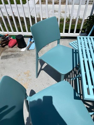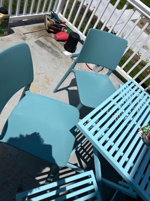 [This review was collected as part of a promotion.] So the blue table I already owned but the chairs are the perfect addition to my set. They’re heavy plastic that will withstand outdoor weather for all seasons. They’re sturdy and stackable so they can be easily stored with we need to. They do get a bit hot in the sun so we plan to put cushions on them. No assembly required as they are ready right out of the box.