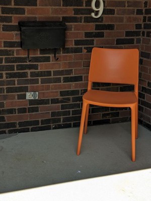 [This review was collected as part of a promotion.] I probably wouldn't have picked bright orange chairs but I actually love how they look in person! It's a fun pop of color on my pretty basic front porch. It's easy for me to envision decorating my porch with these as a focal point - maybe a little side table and plants! These are lightweight and easy for me to move around and stack without help. They are a little tall for my 5'0" frame, so an outdoor cushion would help my feet touch the floor. The resin is easy to clean -you just wipe them with a damp rag. it hasn't gotten super hot here yet but it might retain some heat if you let it sit out in the sun. Overall, these are a very cute upgrade to my basic beige chairs!