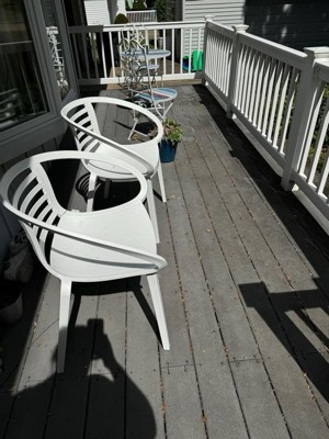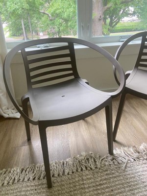 [This review was collected as part of a promotion.] These chairs are the perfect addition to our patio, modern and lightweight yet super durable. I love the unique design and the color is clean and wipeable if spills happen. Comfortable to sit in and could even add a cushion if needed. Love them!