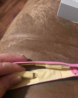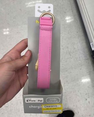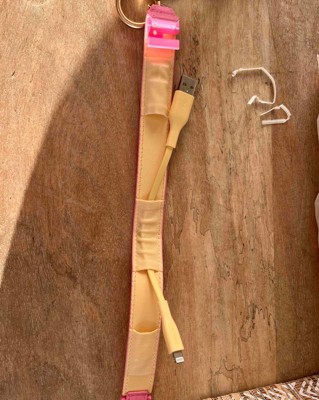 [This review was collected as part of a promotion.] This is a great charging cable that comes with a cute pink wrist strap. It also has a chain to attach it to something. It includes a lightning to usb cable and charges conveniently and quickly. The price was reasonable. I received an incentive to write this review.