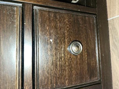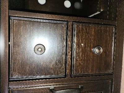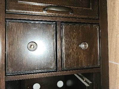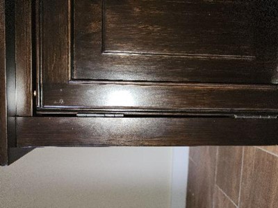 Traditional style Includes vintage raised panel doors and drawers, notched legs, Bronze decorative hardware and metal drawer glides