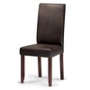 - Chairs are upholstered with a durable premium Brown Faux Leather, solid wood legs in brown and top stitching detail