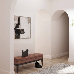 The Bragg Ottoman Bench delivers a perfect blend of style, comfort, and functionality, making it an ideal choice for entryways, bedrooms, or living rooms. Upholstered in a rich distressed saddle brown vegan faux leather, this bench features a padded seat for superior comfort. Its sturdy frame is crafted from durable solid wood, providing long-lasting support. With its compact rectangular design, this ottoman bench fits seamlessly in small spaces, offering versatile seating or a comfortable footrest. The clean lines and vintage-inspired aesthetic complement a variety of interior styles, from modern to rustic. Elevate your home with this timeless piece that’s as practical as it is stylish.