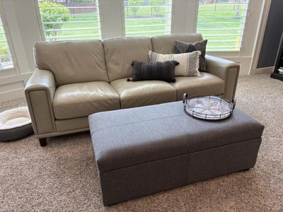 - At 24"D x 48"W x 18"H, this ottoman offers generous seating and hidden storage.