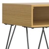 - Features one (1) open compartment for storage and four (4) black iron hairpin legs