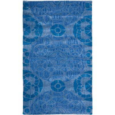 Originating from the skilled artisans of India, each rug reflects a dedication to quality and craftsmanship. The serene blue hues will infuse any room with calmness while maintaining sophistication. Featuring a distinctive pattern that showcases a harmonious blend of ornate medallions and circular motifs, this rug is designed to captivate and add an artistic touch to your decor.