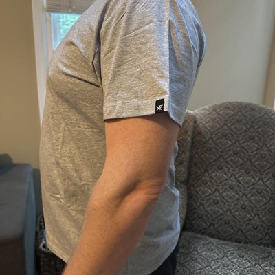[This review was collected as part of a promotion.] This shirt runs a little small for my XL size husband, but not too bad. It feels like athletic fabric. It’s good for running or going to the gym. There is a black logo sewn on one of the arms. I thought the regret was going to look more purple based on the stock photo, but very grey. The material has a good amount of stretch. A little short if you have a midsection. Fits fine through the arms I received an incentive to write this review.