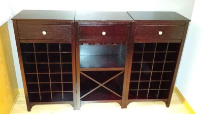 For the price, this little piece works so well. Easy to assemble. Color and finish are perfect. The wine rack holds average height glasses, but not the really tall kind. Drawer is plenty big enough for our corkscrew, caps, chiller and aerator.