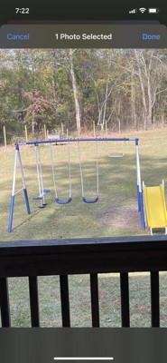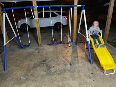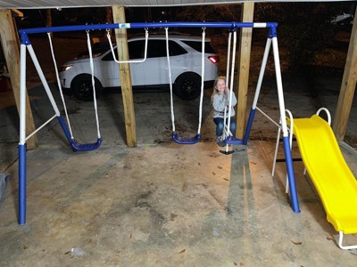 [This review was collected as part of a promotion.] I recently purchased the metallic playground set for my backyard, and it has exceeded my expectations in terms of both durability and entertainment value for the kids. The construction of the playground set is impressively sturdy, ensuring long-lasting use. The metallic frame not only adds to the set's robustness but also gives it a sleek and modern appearance. I feel confident that it will withstand the test of time and the energy of enthusiastic young ones. The two swings included in the set are a fantastic feature. The non-slip swing seats provide an extra layer of safety, allowing the kids to enjoy their playtime without any worries. The chains supporting the swings are robust and well-crafted, catering to a good amount of weight. It's reassuring to know that the set is designed to accommodate children of varying sizes. The highlight of this playground set is undoubtedly the 5-foot slide. It adds an extra element of excitement and adventure for the kids. The slide is not only fun but also well-built, ensuring a smooth and safe descent for the little ones. I highly recommend this metallic playground set for parents looking to create a fun and secure play area for their children. The combination of sturdy construction, non-slip swing seats, durable chains, and the thrilling 5-foot slide make it an excellent choice for endless hours of outdoor play.