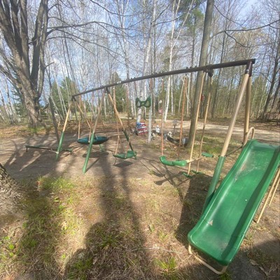 XDP Recreation Deerfield Swing Set,10 Child Capacity Backyard Playground w/ Slide, See-Saw, Trapeze Swing, Fun-Glidr, Swing Seat, & Stand N Swing