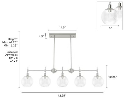 The graceful symmetry of the Xidane 5-light linear chandelier balances elegance with an edgy undertone. Glass orbs hang from metal, shining ambient light down as you entertain guests at your kitchen island or dining table. Make an impression by adding lights from the Xidane collection throughout your home to elevate all your spaces with the glow of glamour. Rated for indoor use only Requires 5 E12 bulbs. Bulbs not included. MADE FOR INDOORS: For use in indoor spaces like kitchens, bedrooms, living rooms, dining rooms, and entryways. BULB RECOMMENDATION: Maximum 60 W per light bulb or equivalent LED bulb. Bulbs not included. CUSTOMIZABLE HANGING OPTIONS: With the minimum required downrod, the hanging length is 16.25 inches. When using all of the included downrod, the maximum hanging length is 64.25 inches.,