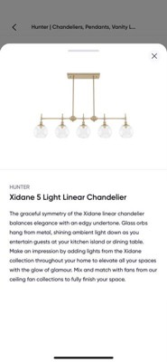 [This review was collected as part of a promotion.] Xidane 5 Light Linear Chandelier The graceful symmetry of the Xidane linear chandelier balances elegance with an edgy undertone. Glass orbs hang from metal, shining ambient light down as you entertain guests at your kitchen island or dining table. Make an impression by adding lights from the Xidane collection throughout your home to elevate all your spaces with the glow of glamour. Mix and match with fans from our ceiling fan collections to fully finish your space.