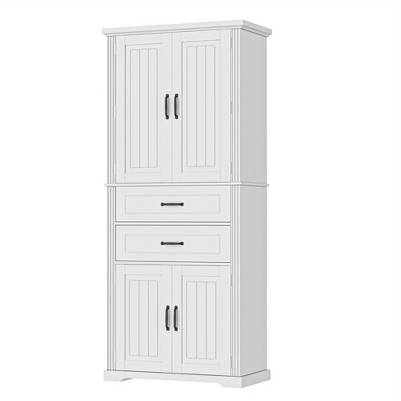 - Boasting two smooth-gliding drawers, five interior shelves, and six small upper-door compartments, this cabinet provides exceptional organization. The bottom shelf adjusts to three heights for flexible storage options, accommodating everything from kitchen supplies to bathroom essentials with perfect versatility.