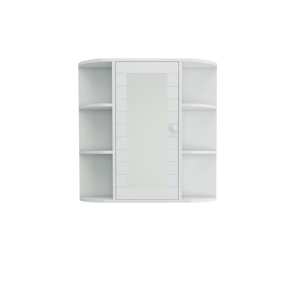 The cabinet’s mirrored doors discreetly hide clutter, with a central compartment ideal for storing private items like medications or personal care products. Six open shelves (three on each side) offer easy access to daily essentials like shampoo, towels, or skincare, keeping them dust-free while maintaining a tidy, organized look.