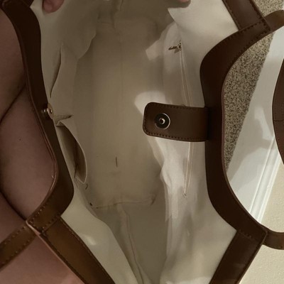 [This review was collected as part of a promotion.] This is the A New Day XL cut out tote handbag. I have to say this bag looks expensive in person. The bottom is lined with faux leather which is great for cleaning. I love both the off white and black options. Each color can work for different seasons. I love the magnetic closure and interior zipper pocket for storage. This can also work for a laptop or tablet. Great for work or around town. I received an incentive to write this review.