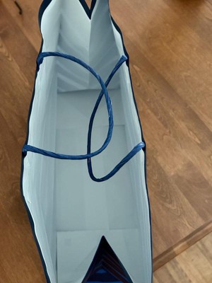 A: The gift bag features a fun blue stripe design on a navy background.