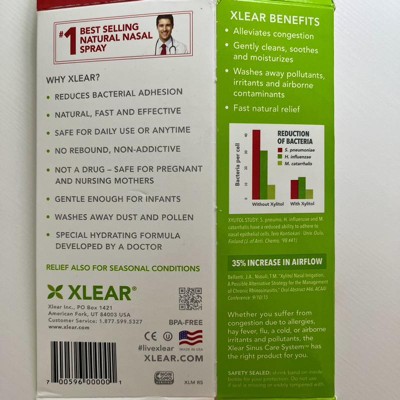 XLEAR Sinus Nasal Spray 1.5oz Safely and effectively alleviate congestion, dry sinuses, and irritated nasal tissues. Our 1.5fl oz measured pump spray bottle is the perfect addition to your daily sinus care regime. Our secret is the patented, natural saline spray containing xylitol—an ingredient which cleanses and moisturizes. Normal saline nasal sprays can dry out the nasal passage, actually leaving it more irritated and susceptible to external contaminants. But with the addition of xylitol, Xlear Saline Nasal Spray with xylitol will moisturize and soothe your sinus and nasal passages. Xylitol also has cleansing benefits; it almost acts like soap for your nose. The industry-leading formula alleviates congestion and also prevents the bacteria and other pollutants from sticking to the nasal tissues. Now you can naturally promote upper respiratory health while alleviating congestion with Xlear Saline Nasal Spray with xylitol!