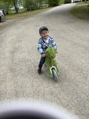 My son loves his toddler bike. He just turned 3, he has short little legs.. like Mumma that he can’t reach the pedals on his trikes. He can stand with his feet flat on the ground with this bike. I also love that the dinosaur is easy to put on, and take off. The first time we went outside with it he was dropping it all over the ground.
