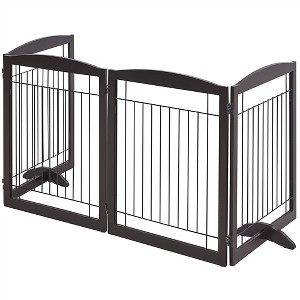 Constructed from a durable MDF and metal, keep your dog, puppy, or other pets confined while you are away. This pet gate with an arched top is a safe and efficient way to limit your pets while offering a decorative and handsome touch to your home. The pet gate is connected with 4 separate panels and secured with sturdy hinges allowing the gate to fold out into a Z-shape or square configuration. Protective footpads and EVA foam protect the floor from scratching and uneven the floor. Suitable doorways, entryways, halls, bedrooms, and staircases.