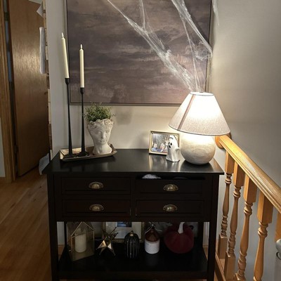 A: Feel happy to know you are interested in our console table. The detailed information of this product are as follows, please kindly reference: Dimensions: 39.5 x 14 x 32’’ (W x D x H) Drawer Inner Size (each): 14.2 x 9.8 x 3.5’’ (W x D x H) Dimensions for shelf: 35 x 12.5’’ (W x H) Ground clearance: 5’’ Hope this could help you well.