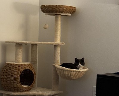 A: Outdoors, you can use it in a covered area, as some parts of the cat tree are fleece covered and not waterproof.