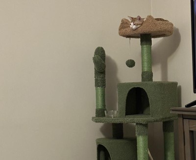 【A Natural and Inviting Vibe】Thanks for its unique and adorable appearance, this cat tree brings a fresh and modern twist to your living space, all while providing your kitty with endless hours of entertainment. Dressed in lush green and brown moppy fabric, it exudes a natural and inviting vibe and seamlessly complements any contemporary decor.