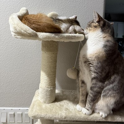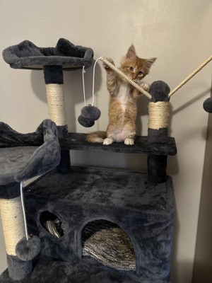 My cats really like this tower. It was easy to put together and a little fun. My one cat, Mynx, was there the whole time I was building it, carefully inspecting it at ever phase. They don't seem to use the very top cushion but they will be up there together on the other two. There's a joke out there that I need a third cat. They like the little houses and I was shocked to see Mynx use them. It's next to a window so they have a good view and they can bathe in the sun. It's very sturdy and it doesn't move much when Mynx takes a run at it. They are sometimes entertained but the dingy balls under the cushions and I'm glad they came with