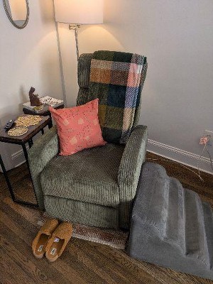 purchased this for our lactation room at work and just had to buy one for our home. it so soft and confy and looks so clean and pretty much combines with all color schemes. the seat feels a bit firm but the back is super soft and love that you can recline and put your feet up!