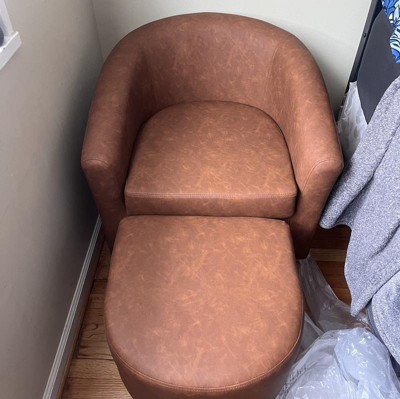 Add a luxurious and chic tone to your home with this barrel chair and ottoman set. Built with a wooden frame and supported by solid wood legs, the accent chair can support 300 lb, and the ottoman is capable of holding 243 lb. The durable and water-resistant faux leather is easy to take care of, adding a touch of luxury to your room. The seat is designed with a generous sitting area and filled with thick foam for utmost comfort, and the curved back perfectly supports your body.