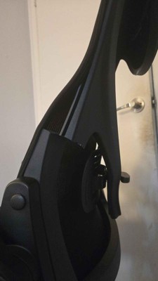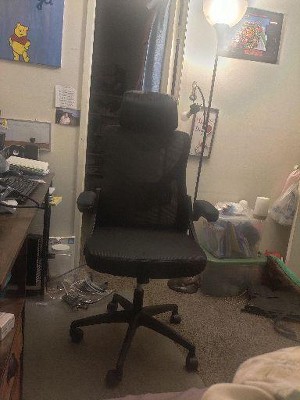 A: This high back office chair's ergonomic features, including a large adjustable headrest, retractable padded armrests, a movable lumbar pillow, rocking function and 3.7-inch adjustable range of seat height, offer customized comfort for extended periods of work, study.