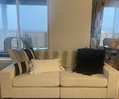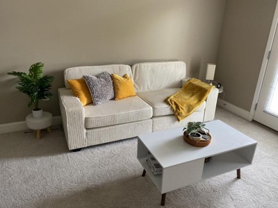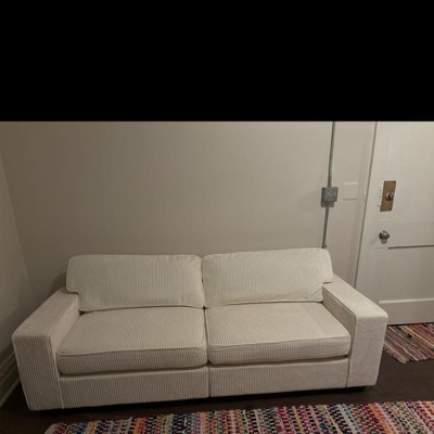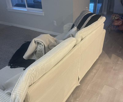I really like this couch. The color is super nice and the ribbed texture is a great touch as well. It makes my space feel super modern. It’s very spacious and bigger than it looks in the pictures. It came in two very large boxes but the assembly was pretty easy. Only thing I dislike is how firm it is. I think that may take sometime but for now it’s tough and the back cushions are really thin and not the greatest to lay back out. You’ll definitely need some throw pillows. Overall it’s a pretty nice couch.