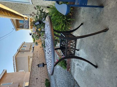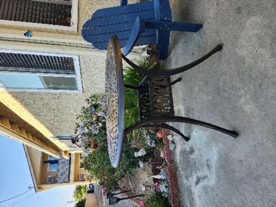 Our elegant patio bistro table is suitable for most outdoor setting or events. Classic & Vintage design with floral-petal-shaped back add more antique charm to your designated place; Sturdy aluminium ensures this patio bistro table is sturdy and durable; Rust-resistant and water-proof coating does not fade easily; Umbrella hole serve more versatility for any outdoor space; Adjustable foot pads help adjust and control the balance of the bistro table according to different patio situation; Our outdoor dining table can be placed in most outdoor events such as an outdoor wedding ceremony, patio setting for cafe and so on.