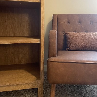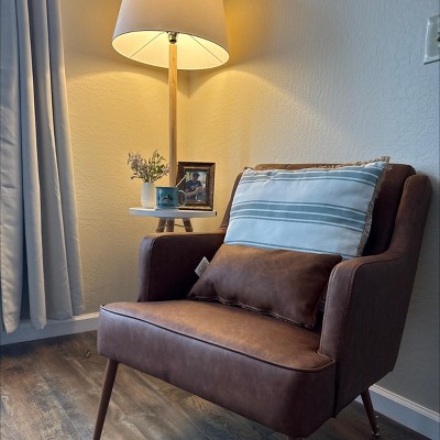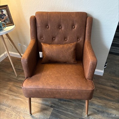 Looking for ways to create a more inviting atmosphere for your home? This accent armchair is the perfect pick for you! It's built on top of four sturdy metal legs for long-lasting stability and durability. The soft cushion, made of faux leather and foam, ensures a cozy and comfortable sitting experience. Featuring a mid-century modern design, this upholstered armchair adds vintage charm to your home. A wide, slanted backrest, large seat cushion, roomy arms and extra lumbar pillow offer ample comfort and support while reading, socializing, or simply relaxing. Imagine sinking into the chair after a long day at work; it's the perfect addition to your living room, reading nook, bedroom, office, apartment,and more.
