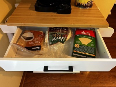 A: Materials: Engineered Wood, Solid Wood, Metal Assembled Dimensions: 32" L × 16" W × 35″ H Countertop Size: 23.6" L × 16" W Drawer Inner Size: 18.7" L × 11.4" W × 3.2″ D for your reference.