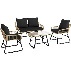 This four-piece wicker conversation set includes a side table, a loveseat, and two comfortable chairs, with plush cushions and pillows for a relaxing outdoor experience. The handwoven PE wicker in a classic Bohemian style adds a chic, vacation-like vibe to your patio, garden, or deck. Designed for flexibility, the set can be easily rearranged to suit your space. The ergonomic armrests and plush cushions ensure comfort, while the weather-resistant PE plastic, sturdy powder-coated steel, and tempered glass ensure long-lasting durability. Easy to maintain, the removable covers can be washed, and the set is simple to clean with a damp cloth. Adjustable foot pads provide stability on uneven surfaces.