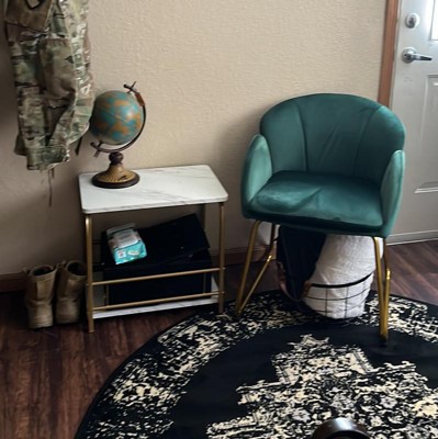 It's made of a solid manufactured wood frame, gold-tone metal legs and soft-to-touch velvet upholstery, providing excellent stability and durability. Soft padded with thick high-density foam, this armchair offers a perfect spot for you to work, dine or relax. The flared backrest perfectly fits your back, providing just-right body support for longer sittings. The padded, round armrest perfectly lines up with your arms, making you more relaxed while sitting. The compact size and lightweight design make this side chair ideal for living rooms, kitchens, bedrooms, offices, apartments, and other small spaces.