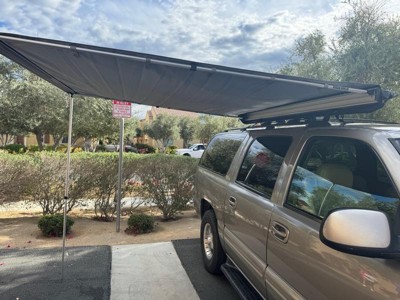 [This review was collected as part of a promotion.] I live in Arizona where the sun shines down pretty strong, even in seasons other than summer. I use to haul around an EZ-Up in the back of my 4runner but it would take up a bunch of space and be a pain to setup. This Yakima awning is the perfect solution. Getting it installed on my 4runner crossbars was a breeze with the help of my wife, probably took about 20 minutes. The awning is the perfect size and provides ample shade. Setting up the awning is easier if you have a friend, but can be done with one person but is a little more challenging. The aluminum bars hold the tarp in place, and stable to the ground. If it’s windy or rainy you can cinch down the awning tarp with the supplied lines and stakes. Then when you’re all done it’s easy to put back into its provided supper pouch! Love it for quick shade!