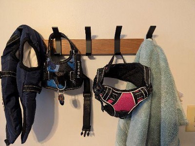 [This review was collected as part of a promotion.] Love the look and utility of this coat rack. Was difficult to install and the provided drywall screws were terrible, cracking and getting stuck upon installation, so ended up needing to purchase drywall anchors separately. The hooks need some kind of adhesive/notch to hold them on the rack, because they are not fully secure and slide around a bit. They should really just come pre-attached to the wood.