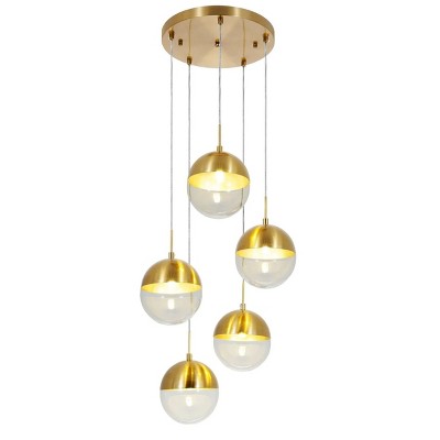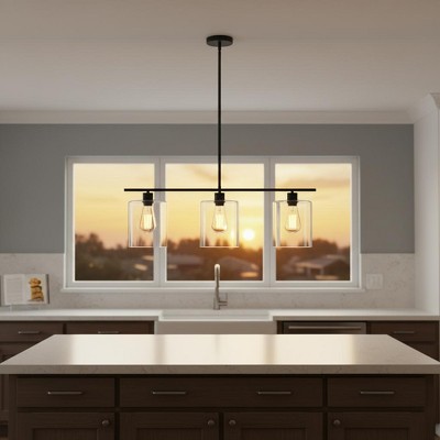 This island pendant light features 5 heads with a sleek black finish and clear glass shades measuring approximately 5.91 by 6.69 inches. It comes with three adjustable suspension rods, each about 11.81 inches long, allowing customizable hanging height to suit your space. Designed for E26 base bulbs (not included), it offers flexibility in bulb choice and brightness. Perfect for kitchens or dining areas needing elegant and functional lighting.
