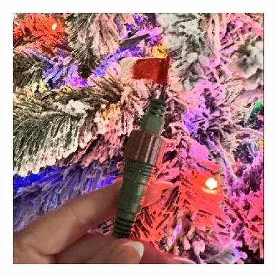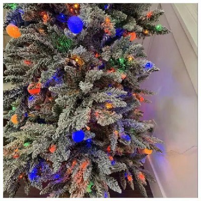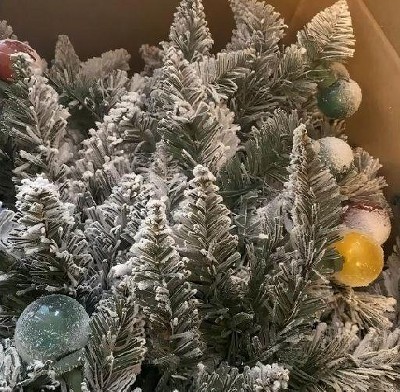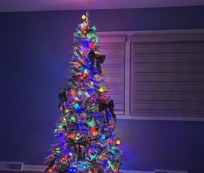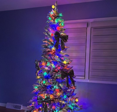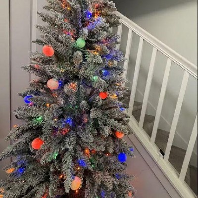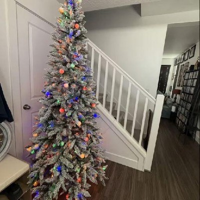 This tree is so beautiful and realistic. The branches are snowed flocked, and decorated with multicolored LED lights and red, yellow, green and blue Christmas decorations balls. Love it. Setting up was so easy. Great addition to our Christmas decor.