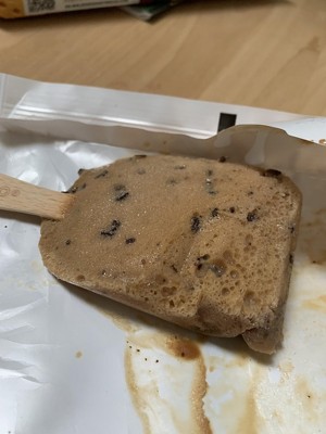 Product had melted and was refrozen. There was no stick available to hold on to had to cut up and eat and bowl. Text you was gritty due to the thawing/refreezing.