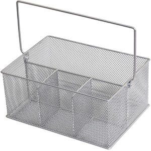 - MESH UTENSIL & CONDIMENT CADDY - Serve and display your utensils, napkins, and condiments on the dining table with this four compartment mesh utensil caddy – featuring a carrying handle to keep silverware and sauce supplies upright and accessible