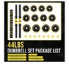 [2-In-1 Adjustable Dumbbell Set]Equipped with a free weight dumbbell set connecting rod, it can be turned into a light barbell and a heavy barbell. The weight range of the light barbell is 5-9 LBS; the weight range of the heavy barbell is 11-44 LBS.[Double Lock Design]There are 2 kind of fixed nuts to ensure your safety. Just assemble the dumbbell plate with 2 nuts and you can get different weights to start your exercise.[Premium Material]Made of premium PE coating, the dumbbell weights is no harm to your body. Filled with different proportions of iron sand, the dumbbell weights are sturdy and long-life use.[44 LBS Dumbbell Set Package List]4 x 4.5 LB Dumbbell Weight Plate, 4 x 3.5 LB Dumbbell Weight Plate, 4 x 2.5 LB Dumbbell Weight Plate, 2 x Dumbbell Bars, 1 x Connecting Bar, 8 x Nuts.[Great for Home Gym] The dumbbell set can be used as dumbbells in 2 styles and barbell weight in 2 styles, which can meet your different needs of exercise in your home gym.Any questions about the adjustable dumbbell set, please feel free to contact us.