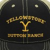 CUSTOM DESIGN: The Yellowstone logo decorates the front of this cap while yellow letters above and below the logo spell out, "Yellowstone Dutton Ranch." Yellowstone fans will love this fun custom design.