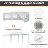 Features:- 10x20ft tent offers 200 sq. ft. coverage, can hold approx. 25 people with seating- UV-resistant & Water-resistant, roof & sidewalls are made of PE, ideal for outdoor use- Removable Sidewallswith hook & loop fastener, easy to remove when not needed- Metal frame with rust-resistant powder coating for durability- Easy to install & no tool required- Using Suggestion - Baseboard with holes for inserting stakes to ensure stability when using on the lawn, can use with sand bags (not included) to add extra stability; To prolong the service life, we do not recommend to use the tent when there is a strong wind or under bad weather- Wide application, ideal for outdoor events, small parties, tradeshow, camping, etc. Specifications:- Model: 10 x 20 ft- Overall Dimension(LxWxH): 235 13/16" x 118 1/8" x 99 5/8" (599 x 300 x 253 cm);- Sidewall Size (LxH): 10 x 6 7/12 ft (3 x 2 m) - Frame Material: White Powder Coated Steel /w PE Joint Fittings- Net Weight: 19.8 Lbs (9 kg)Package Contents:- 1x Top Cover- 4x Sidewalls with Windows- 2x Sidewalls without Window- 1x Tube Set- 1x Accessory set- 1x ManualNotices:- 1.It requires 2 people to set up the tent for fast erection.- 2.Polyethylene is not fireproof, please keep away from fire sources.- 3.Please don't leave canopy up overnight or under bad weather conditions. Tents are temporary structures designed to handle most normal weather conditions. Evacuation of tents is recommended under bad weather or other unsafe conditions. We will not be liable for poor weather conditions or natural disasters.